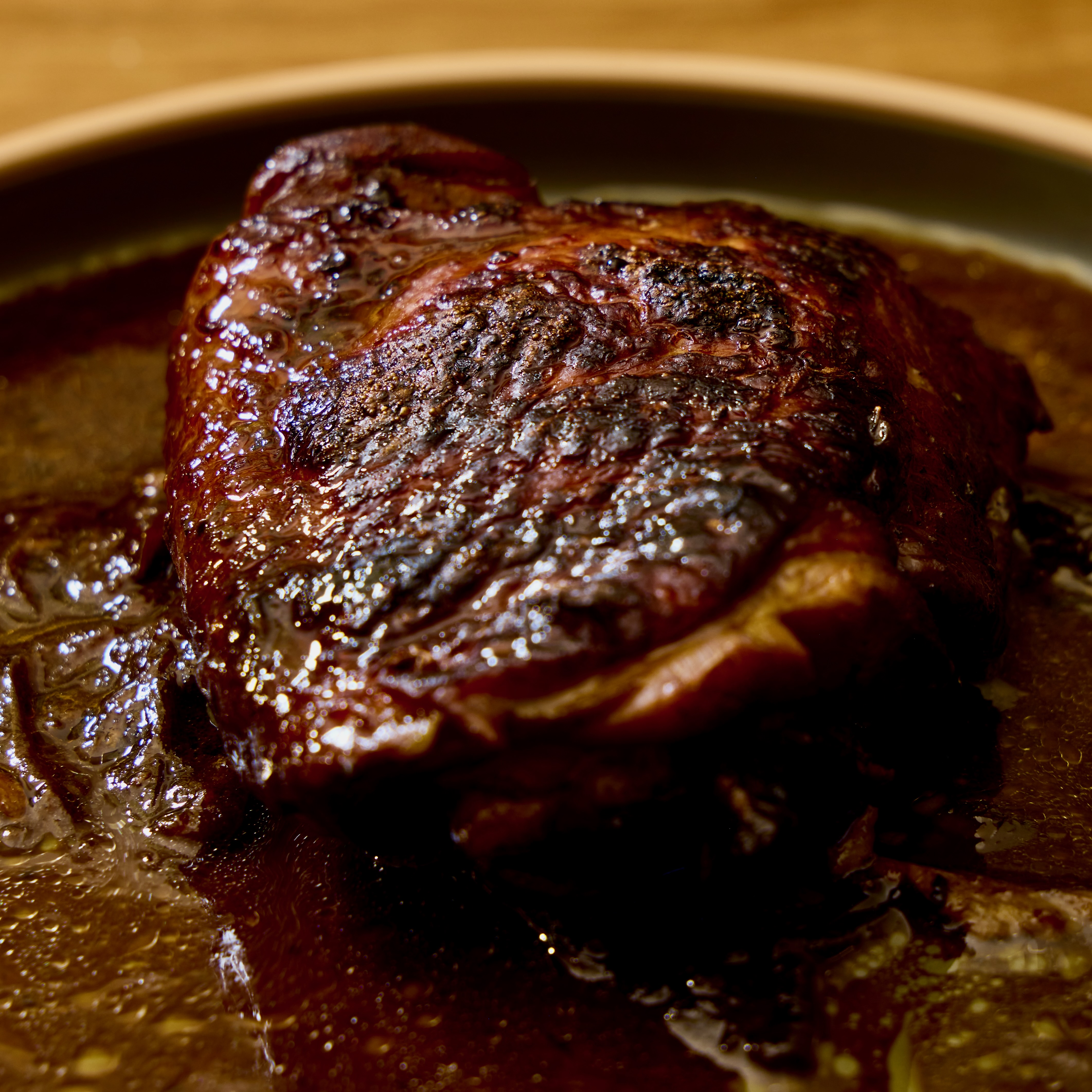 - Continue reducing the liquid until it reaches a glossy, lightly syrupy consistency.
