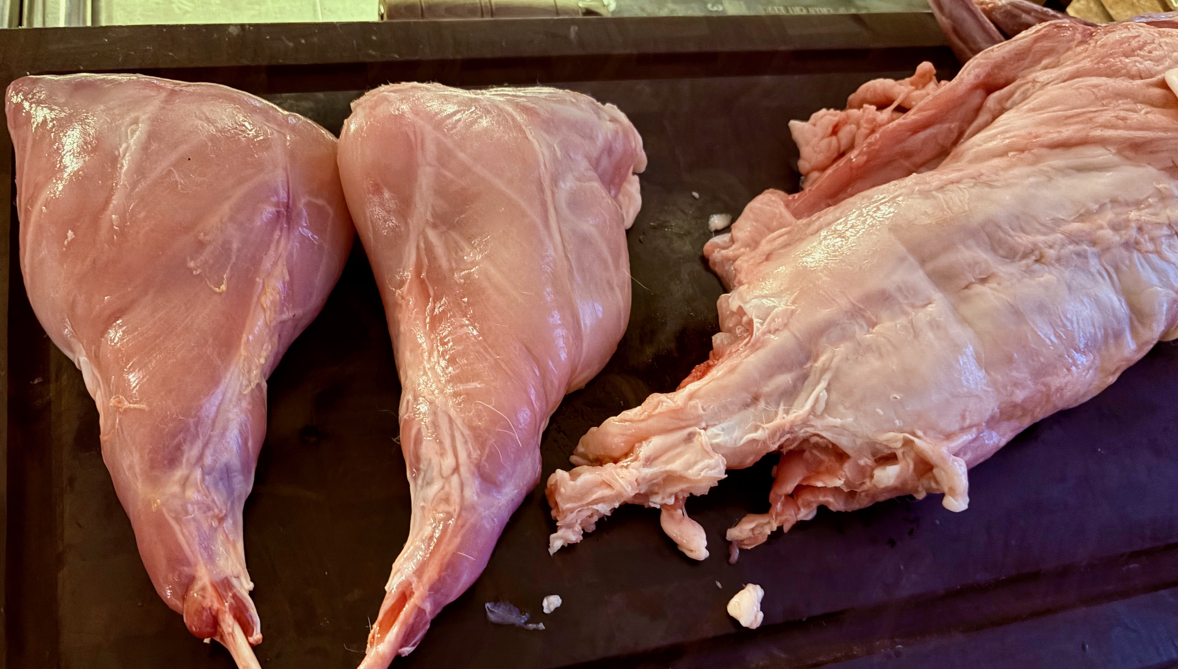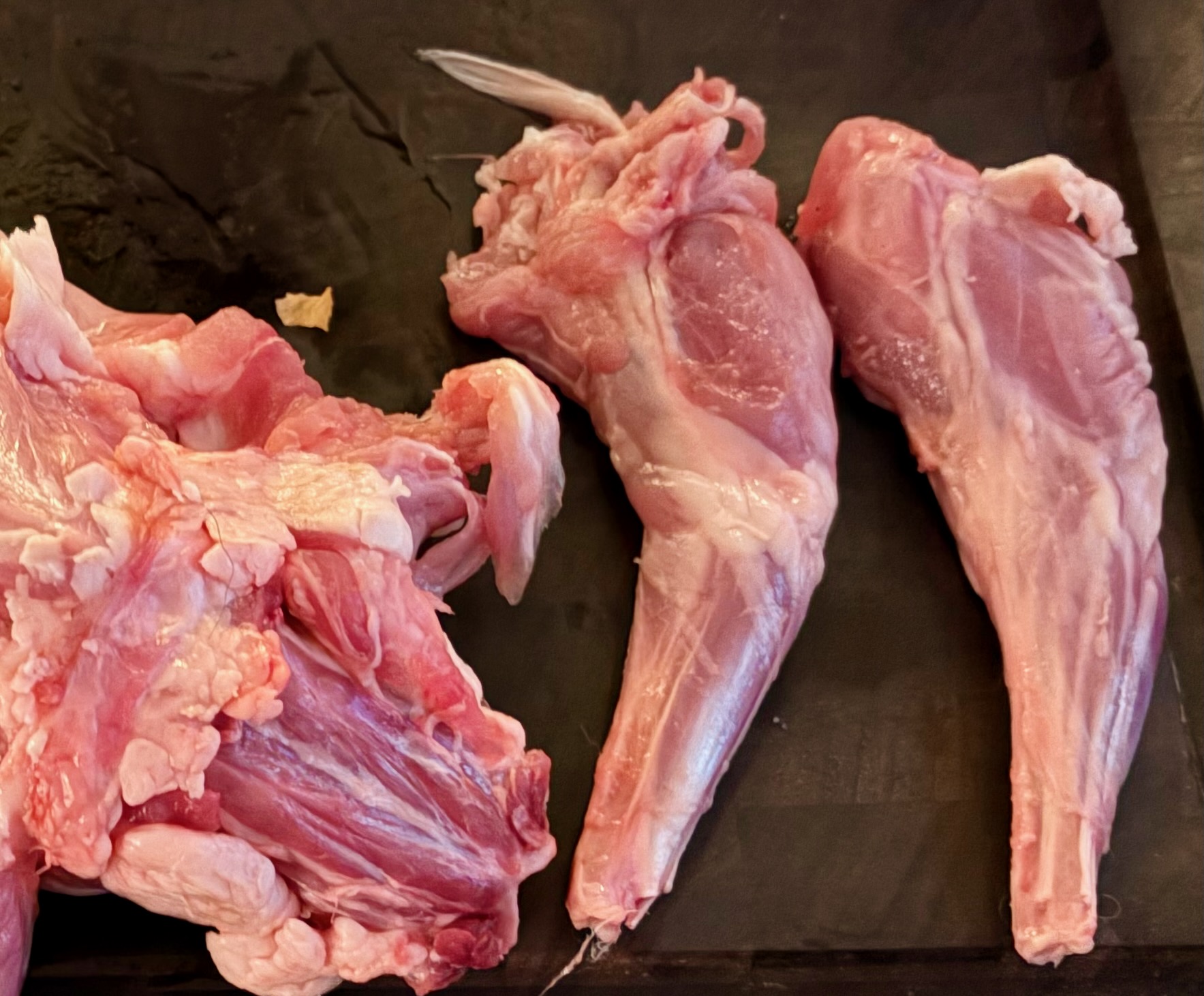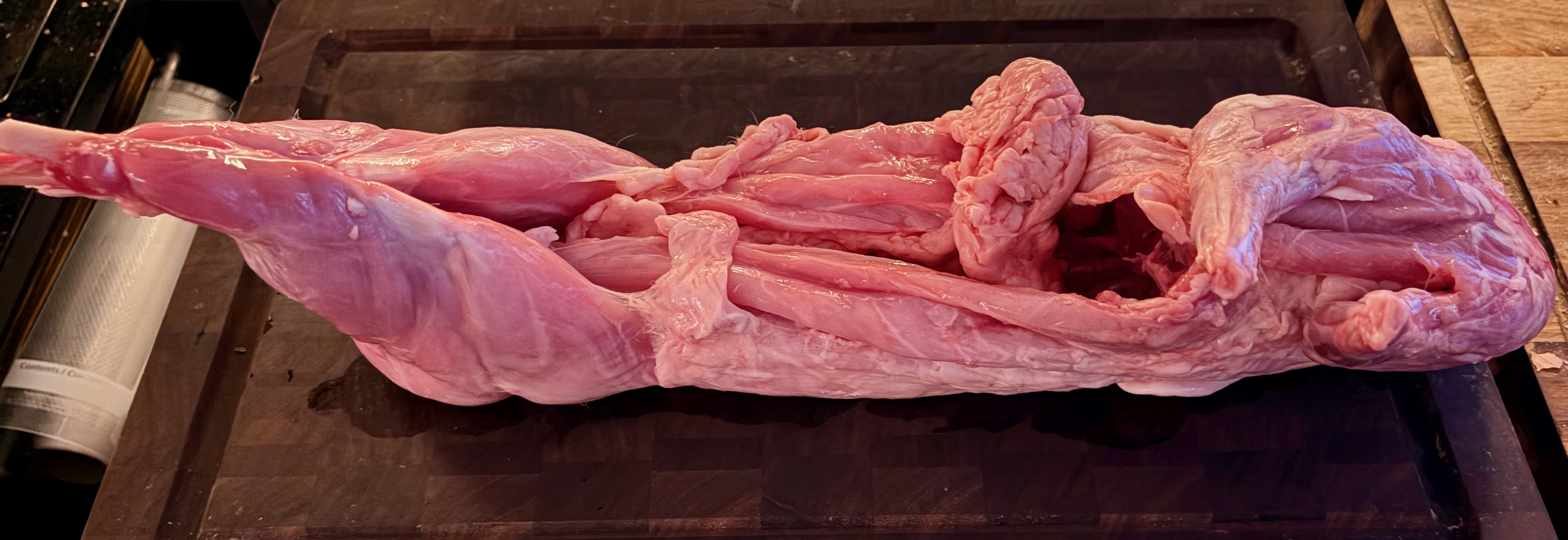 - Trim off the two thin belly flaps attached to the saddle and set them aside. You should now have a rectangular saddle section about 3–4 inches long with a portion of backbone and loin meat on either side. Add the saddle to the bowl with the legs.