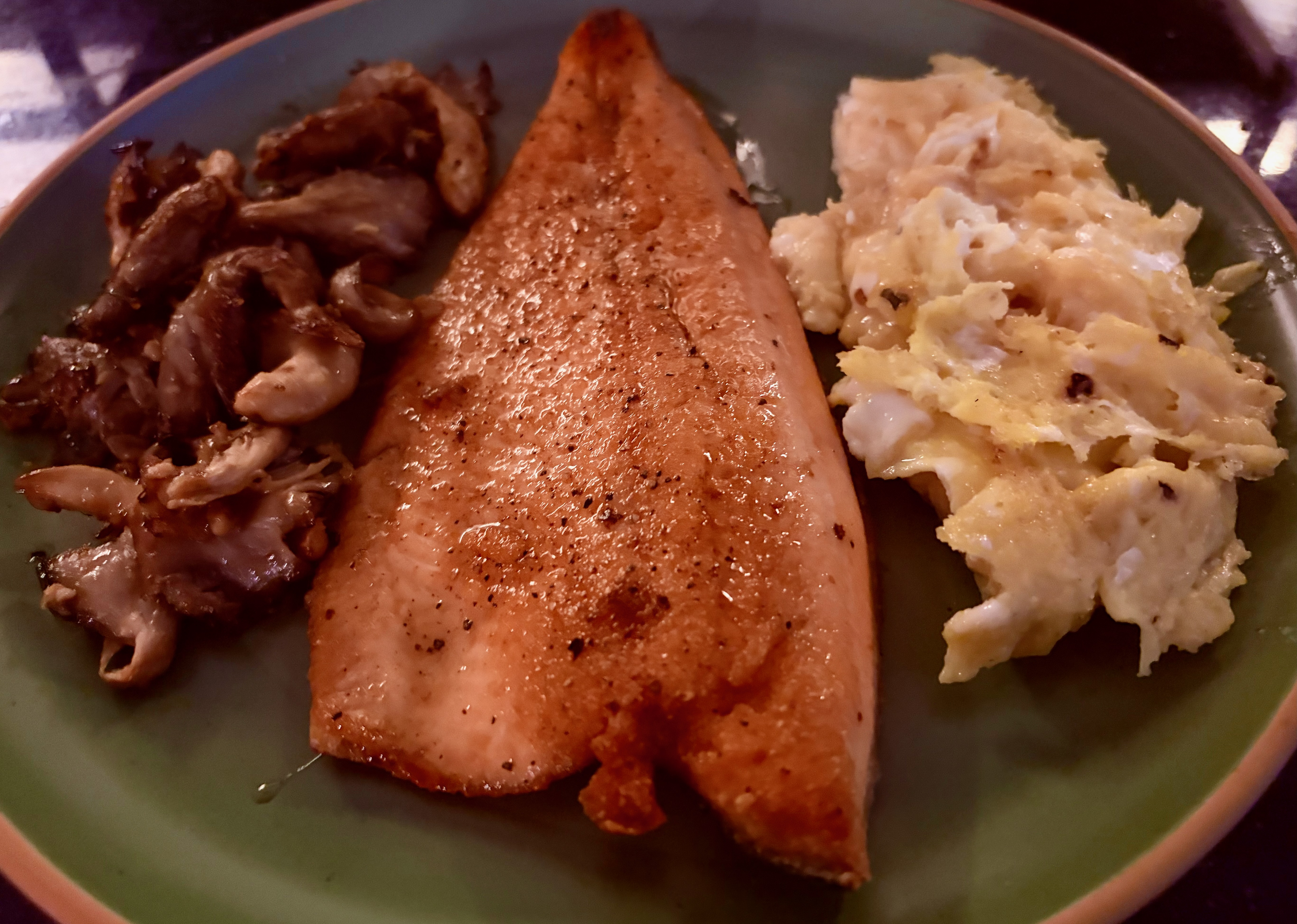 Divide the scrambled eggs between two warm plates. Top each with a trout fillet (flesh side up) and spoon the warm mushroom mixture over the top. Serve immediately.